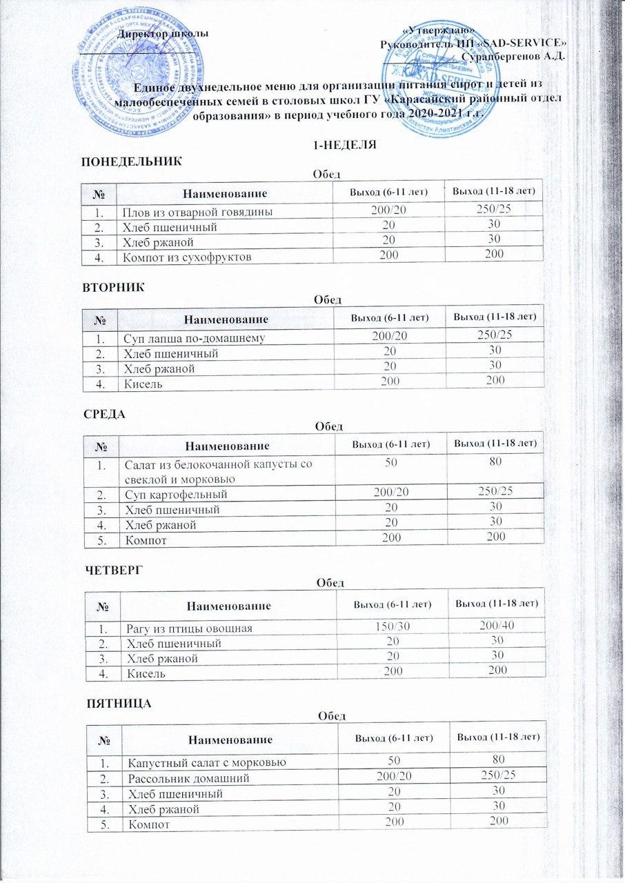 Единое двухнедельное меню для организации сирот и детей из малообеспеченных семей в столовых школ ГУ “Карасайский районный отдел образования” 2020-21