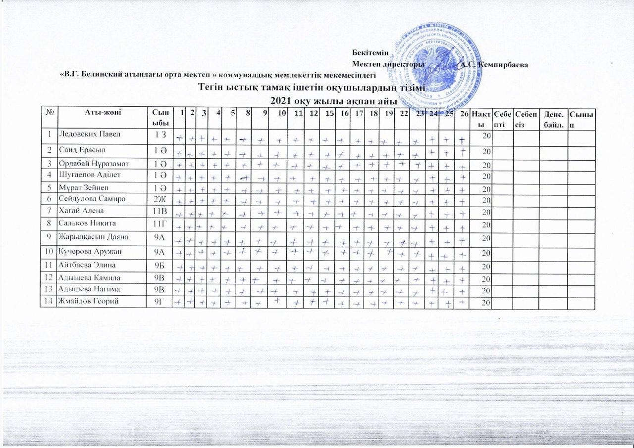 Тегін ыстық тамақ ішетін оқушылардың тізімі 2021 оқу жылы » В. Г. Белинский атындағы орта мектеп